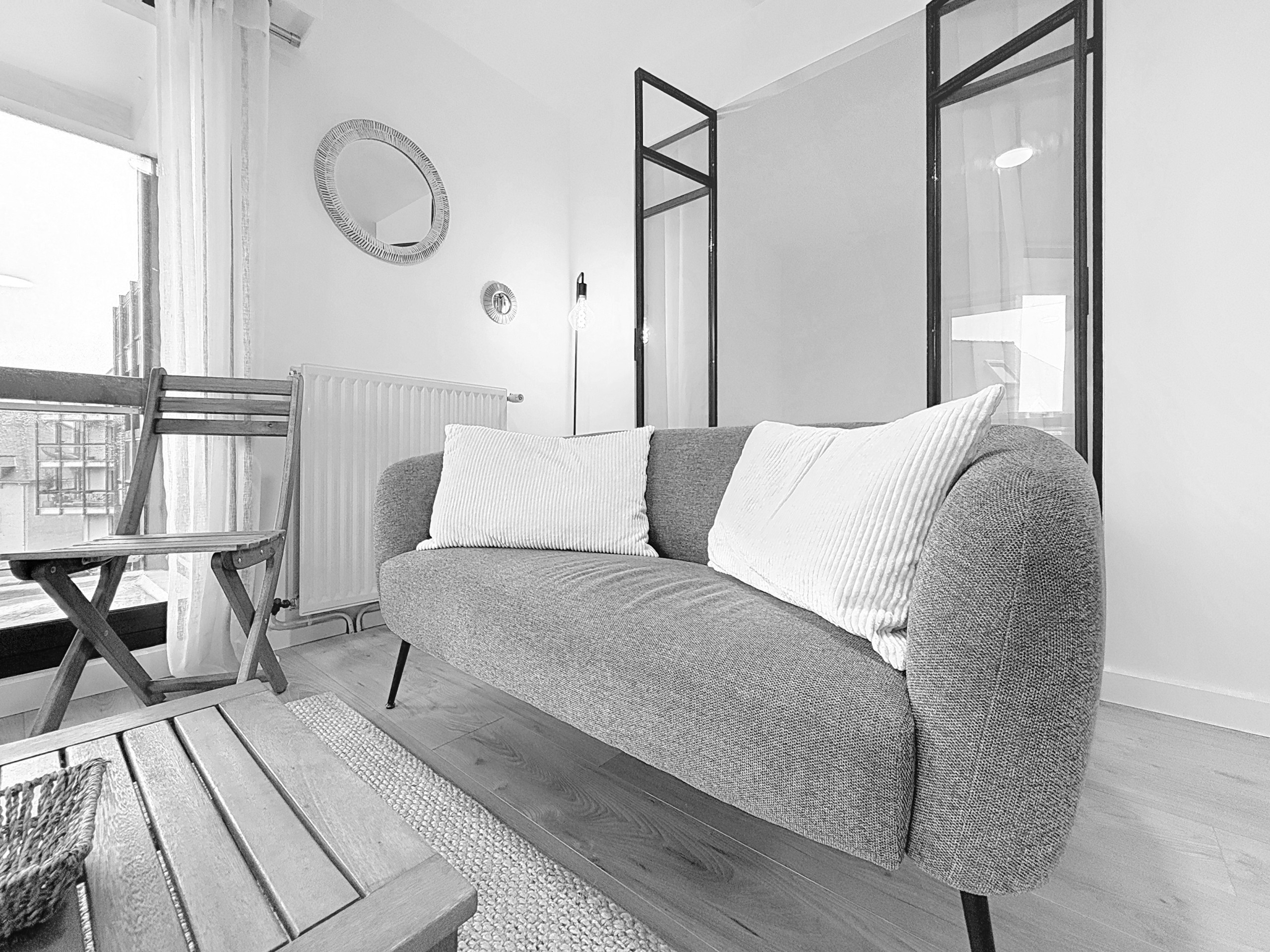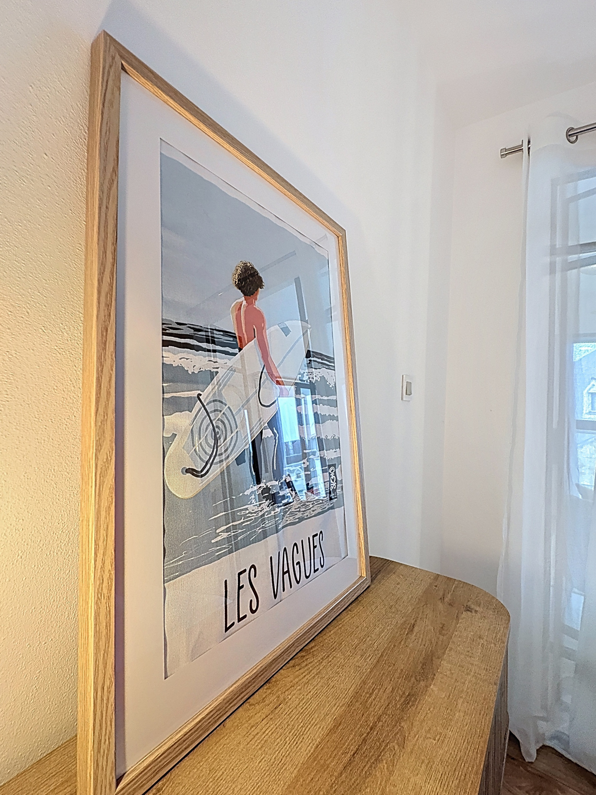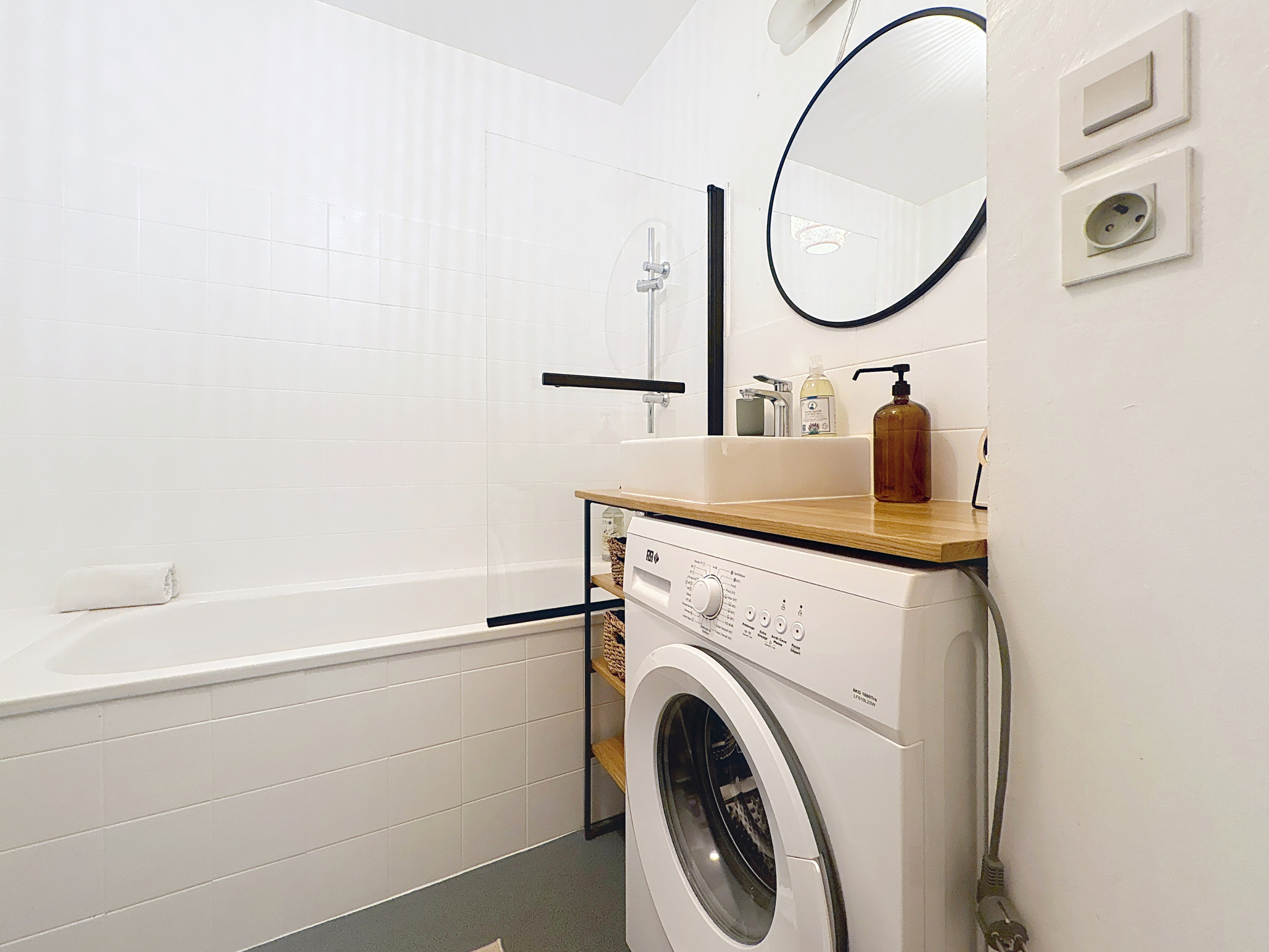 Les intérieurs d’environ 32 m², sont en très bon état et particulièrement chaleureux. Ils s’ouvrent sur une agréable pièce de vie avec, d’un côté, un espace repas et cuisine, et de l’autre côté, un coin salon avec TV. La chambre cosy, avec un lit double, est séparée du salon par une verrière, offrant de l’intimité. La salle de bain est pratique et fonctionnelle, avec baignoire et WC. Enfin, le balcon permet de profiter d’un environnement calme et d’équipements complémentaires tels que lave-linge, cafetière filtre et Internet fibre optique.