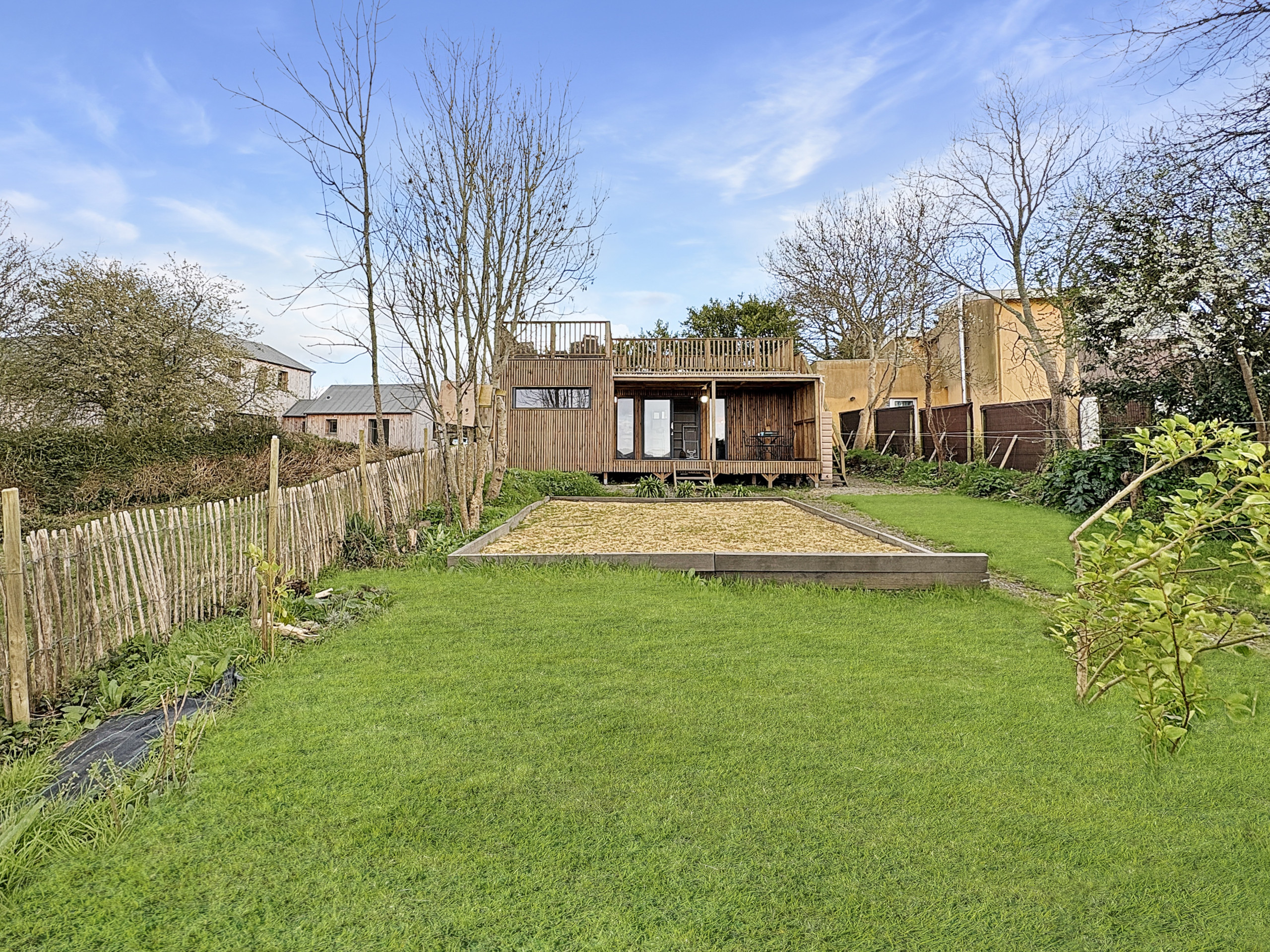 Les extérieurs comprennent une cour de stationnement pour deux véhicules, un joli jardin et une double allée de boules. L’environnement permet de profiter pleinement des paysages côtiers et des promenades à pied ou à vélo.