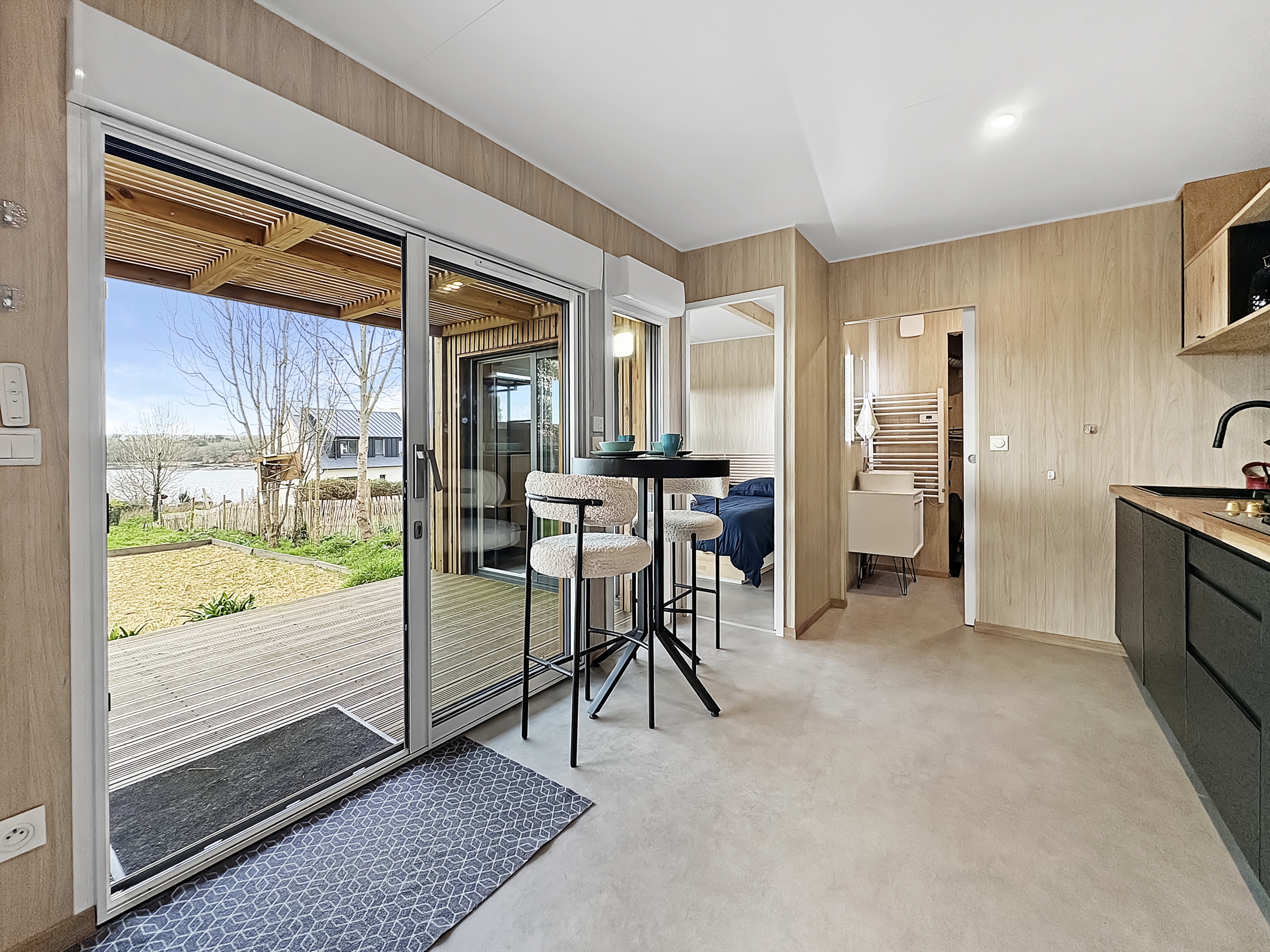 Les intérieurs, de 30m2, sont conçus pour offrir tout le confort nécessaire et sont agencés comme suit : une pièce de vie lumineuse avec espaces salon et coin repas, une cuisine aménagée et équipée, une salle d’eau fonctionnelle avec lave linge ainsi qu’un espace nuit confortable. L’ensemble donne en accès direct à la terrasse principale. Une seconde est accessible sur le toit de la maisonnette offrant une jolie vue sur la mer/Rade.