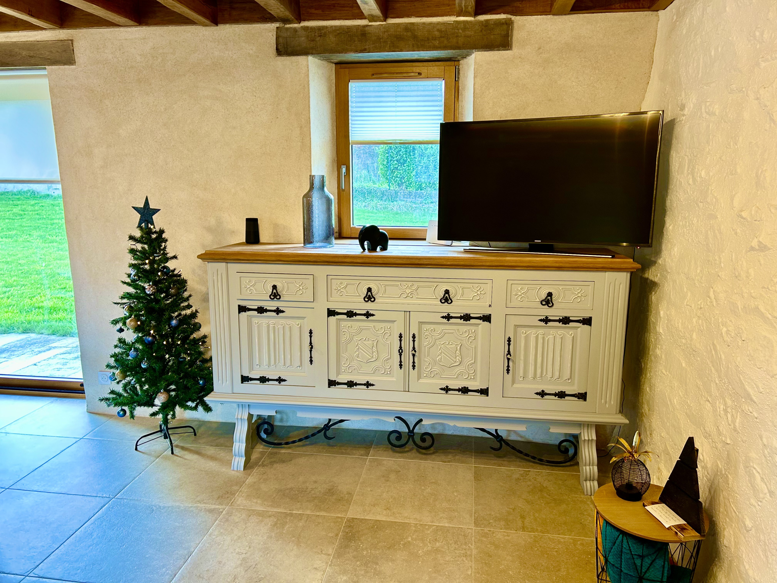 - En rez-de-jardin : une entrée avec rangement, une généreuse cuisine très bien équipée avec un comptoir, un séjour avec accès direct à la terrasse bois et au jacuzzi, un salon avec insert à bois un peu en retrait avec espaces tv et jeux (baby-foot notamment), une suite avec une jolie chambre avec lit en 180*200cm et sa salle de douches privative associée, un wc indépendant.
