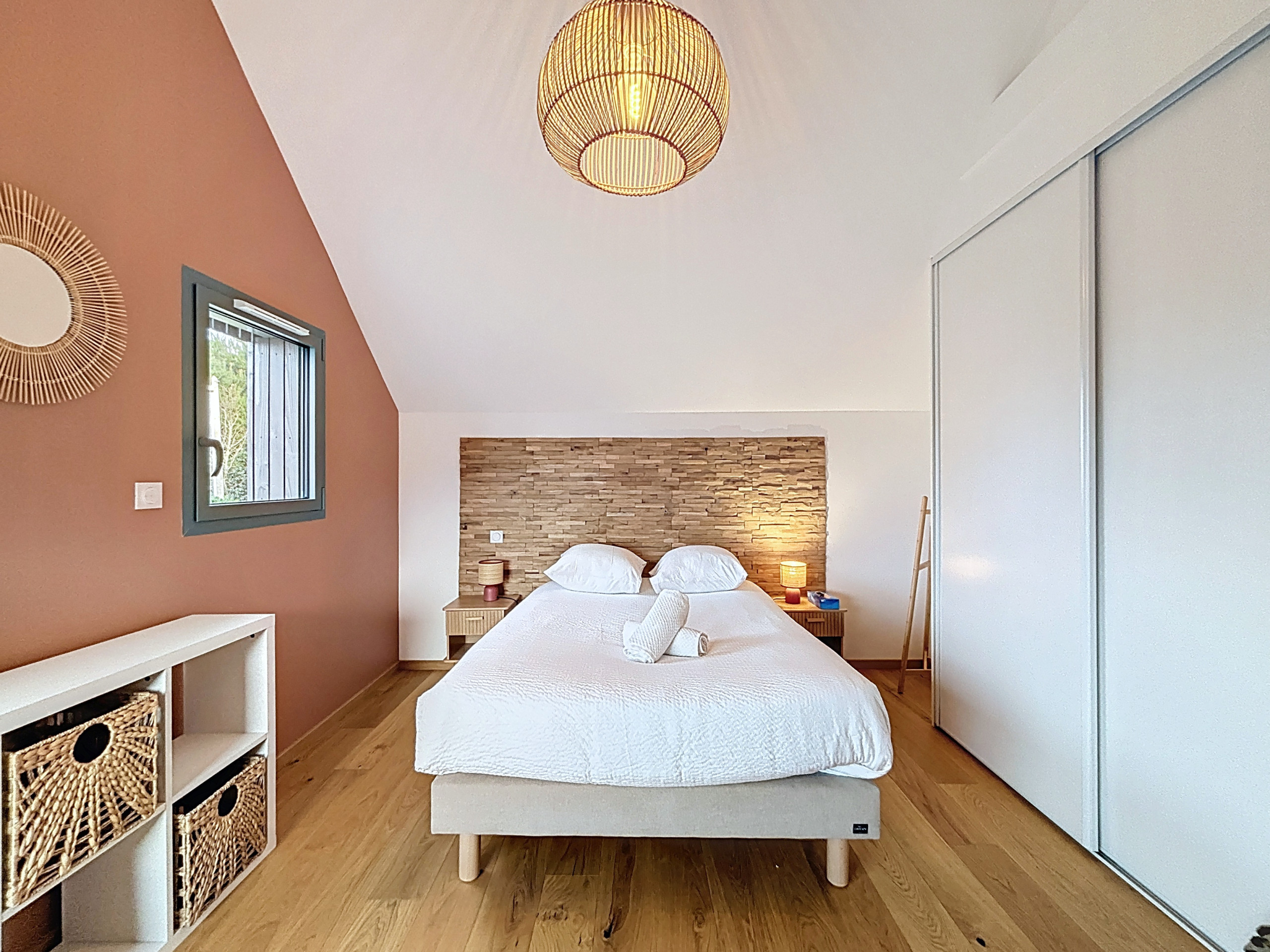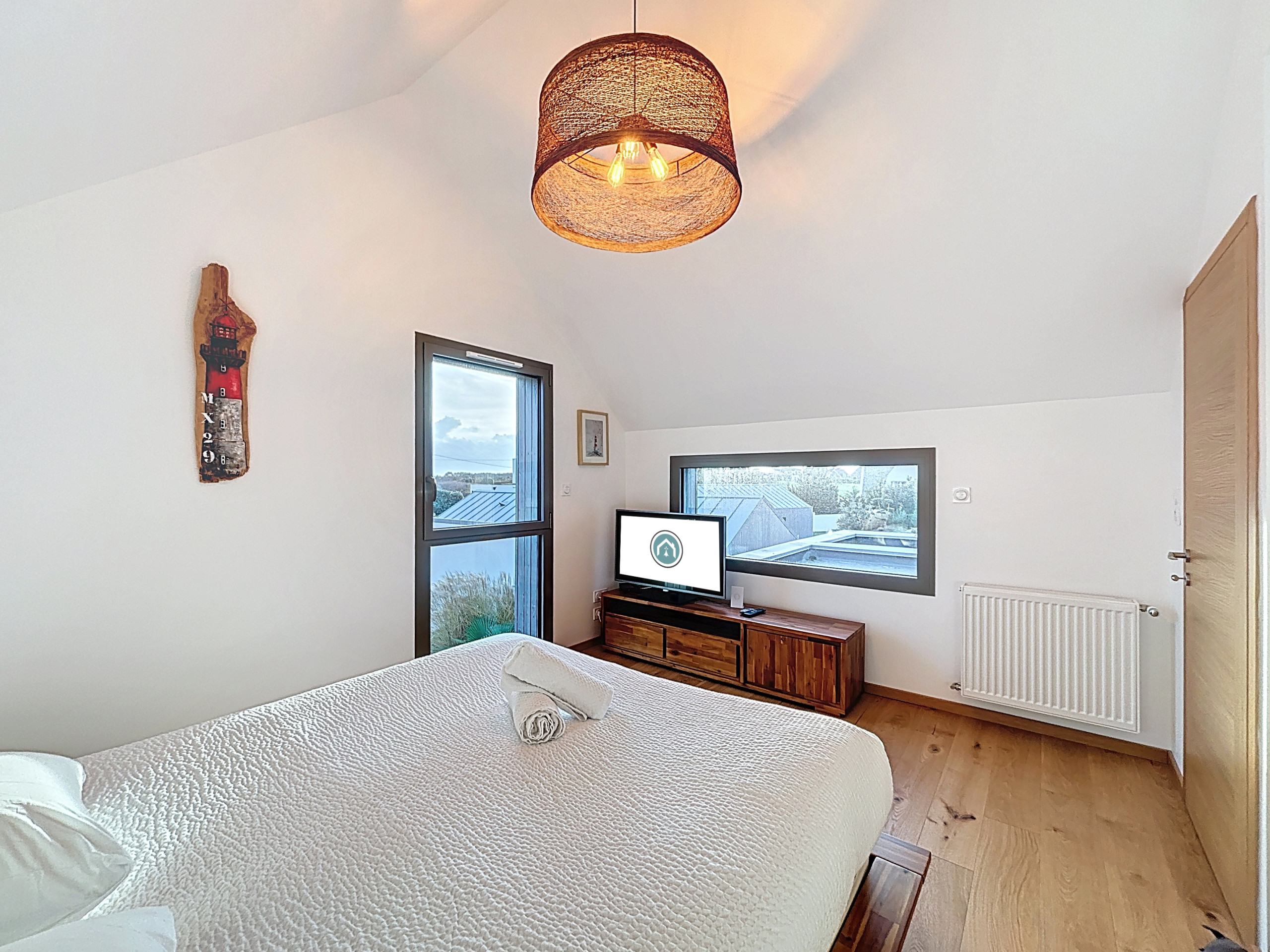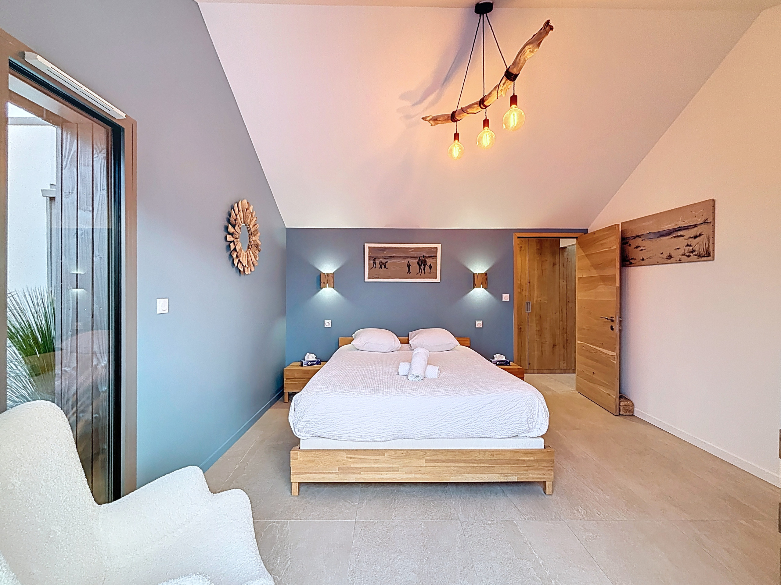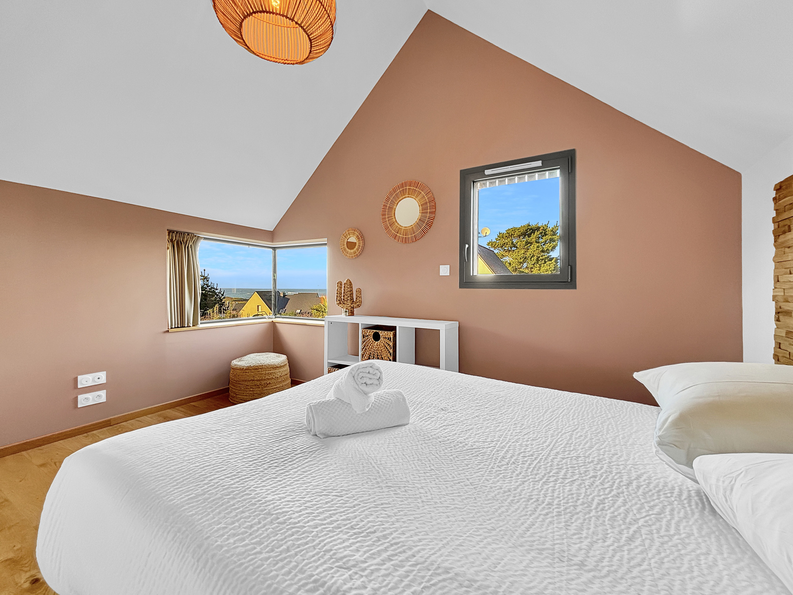 - à l’étage : avec une jolie vue sur la mer, un palier desservant : une remarquable mezzanine sous plafond cathédrale vous permettra de jouer quelques notes de piano, de travailler grâce au bureau dédié ou de vous détendre sur le canapé ou sur les filets suspendus. Par la suite, deux confortables chambres : une avec un lit en 140*190cm et placards, l’autre avec lit 160*190cm, tv et commode. Une salle de bains, une pièce de lecture, un bureau, un wc indépendant.