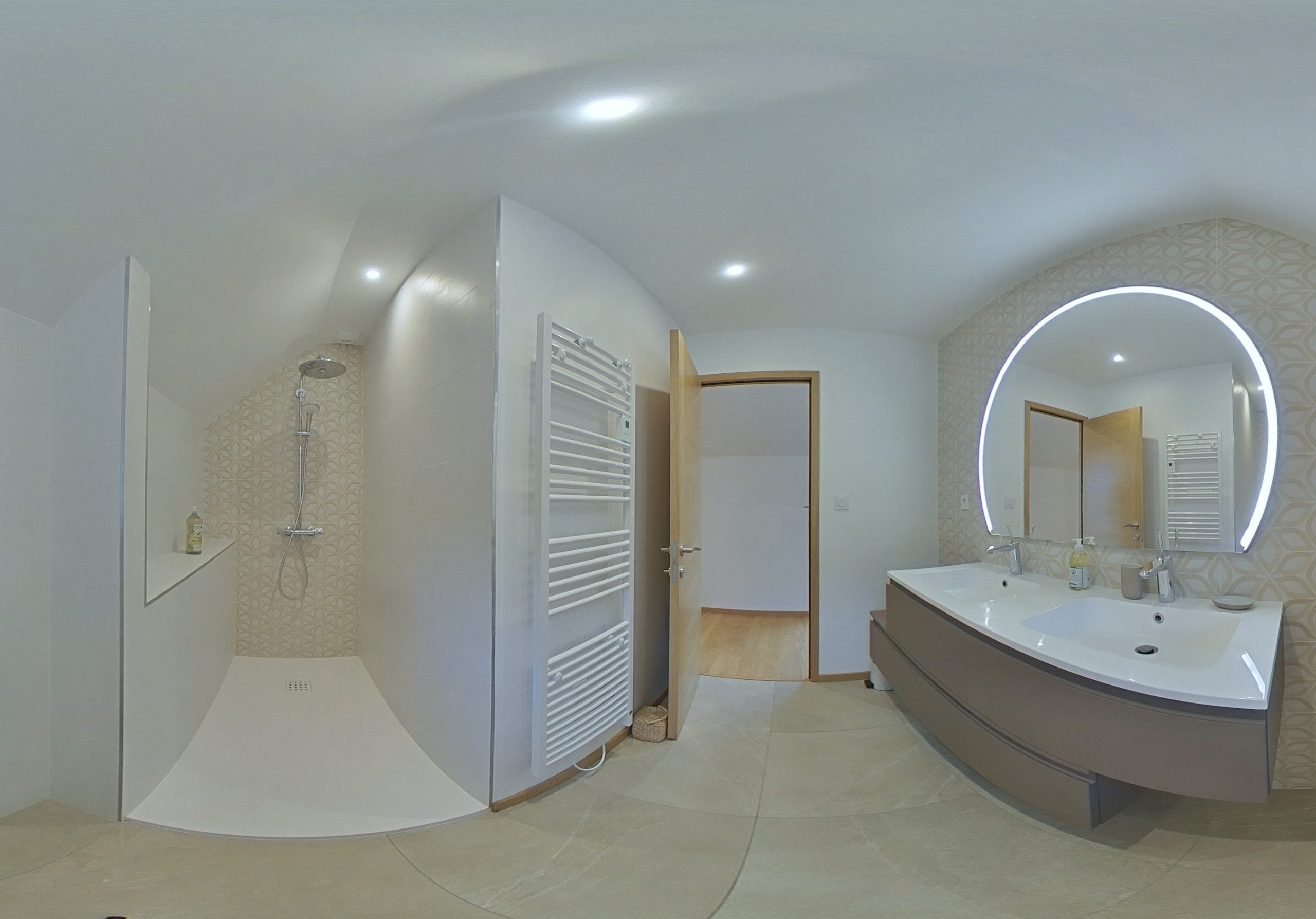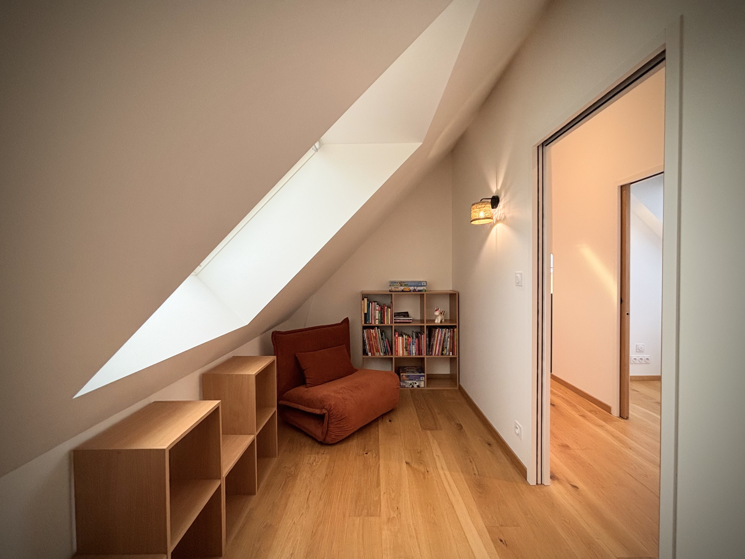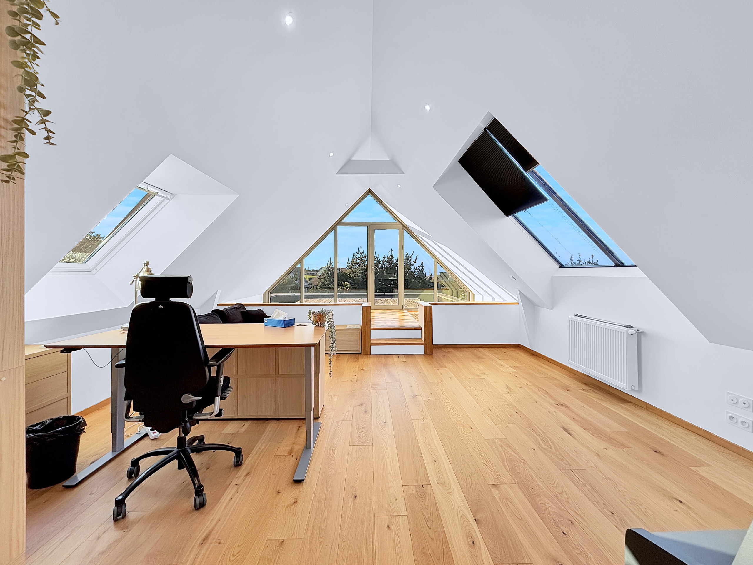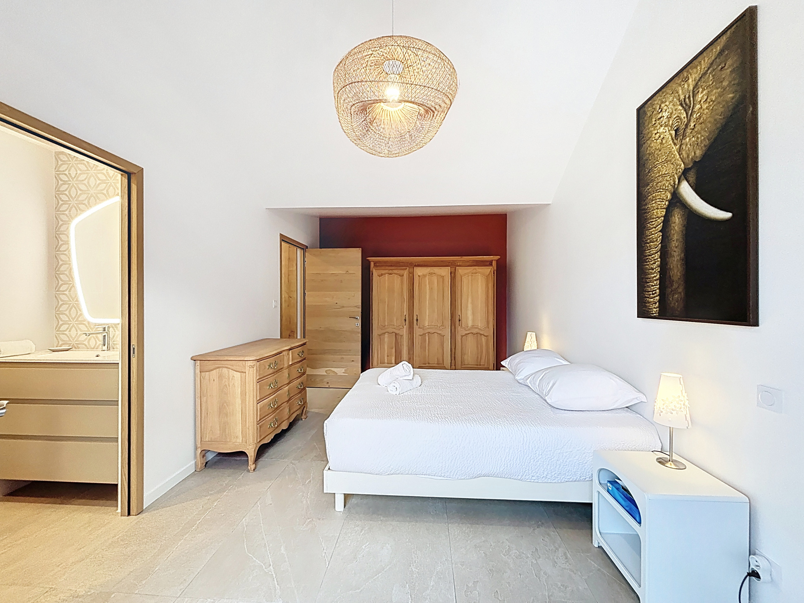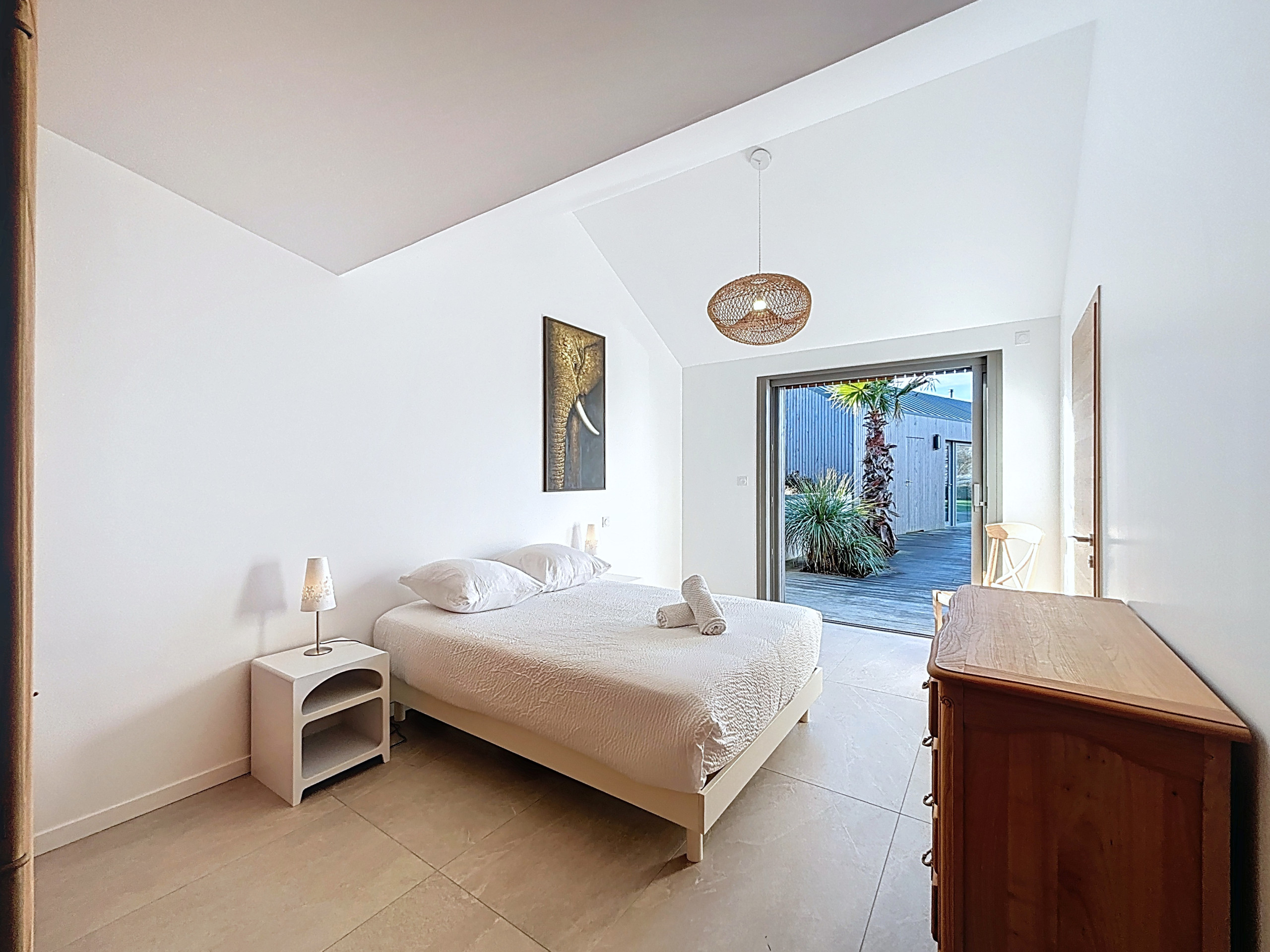 - à l’étage : avec une jolie vue sur la mer, un palier desservant : une remarquable mezzanine sous plafond cathédrale vous permettra de jouer quelques notes de piano, de travailler grâce au bureau dédié ou de vous détendre sur le canapé ou sur les filets suspendus. Par la suite, deux confortables chambres : une avec un lit en 140*190cm et placards, l’autre avec lit 160*190cm, tv et commode. Une salle de bains, une pièce de lecture, un bureau, un wc indépendant.