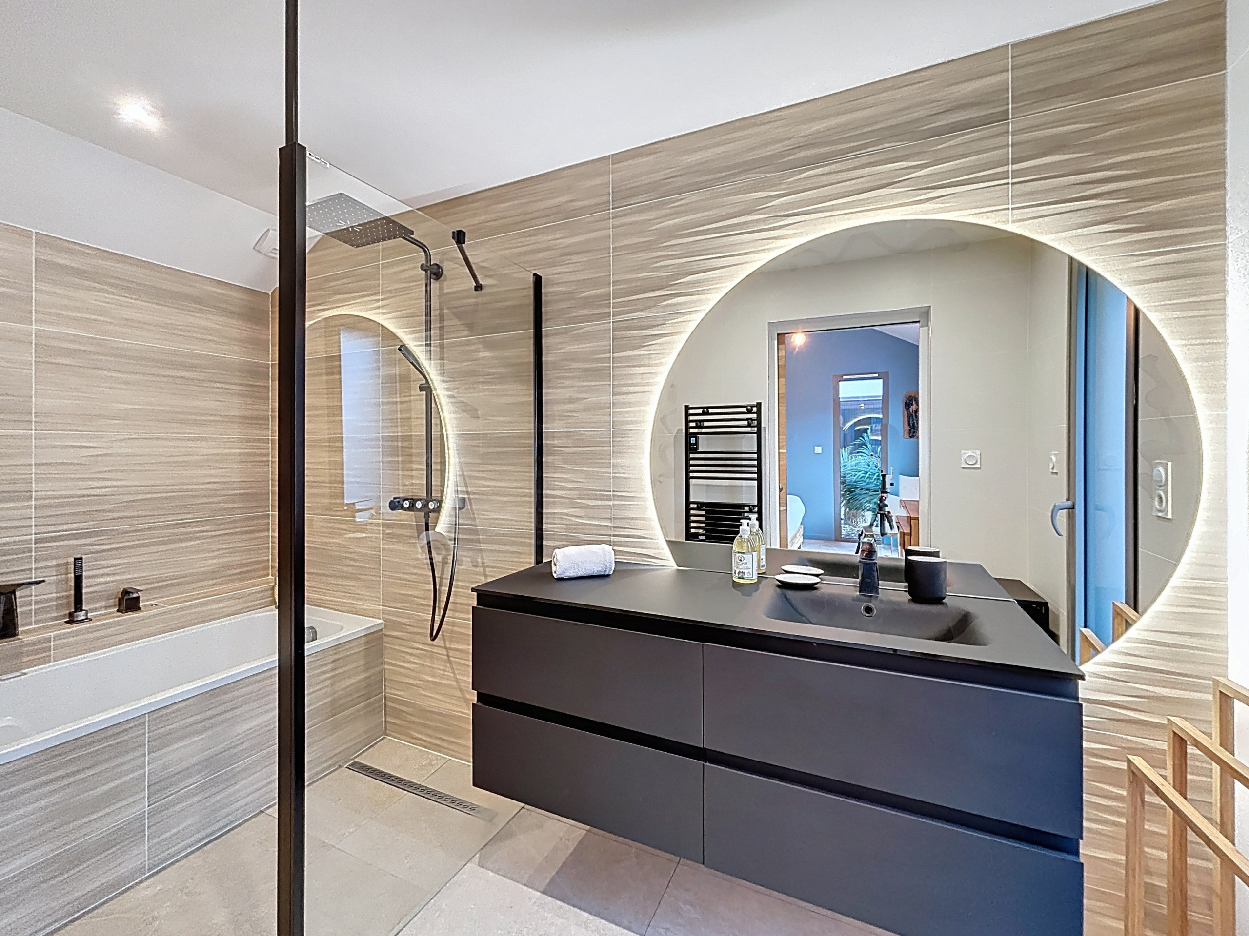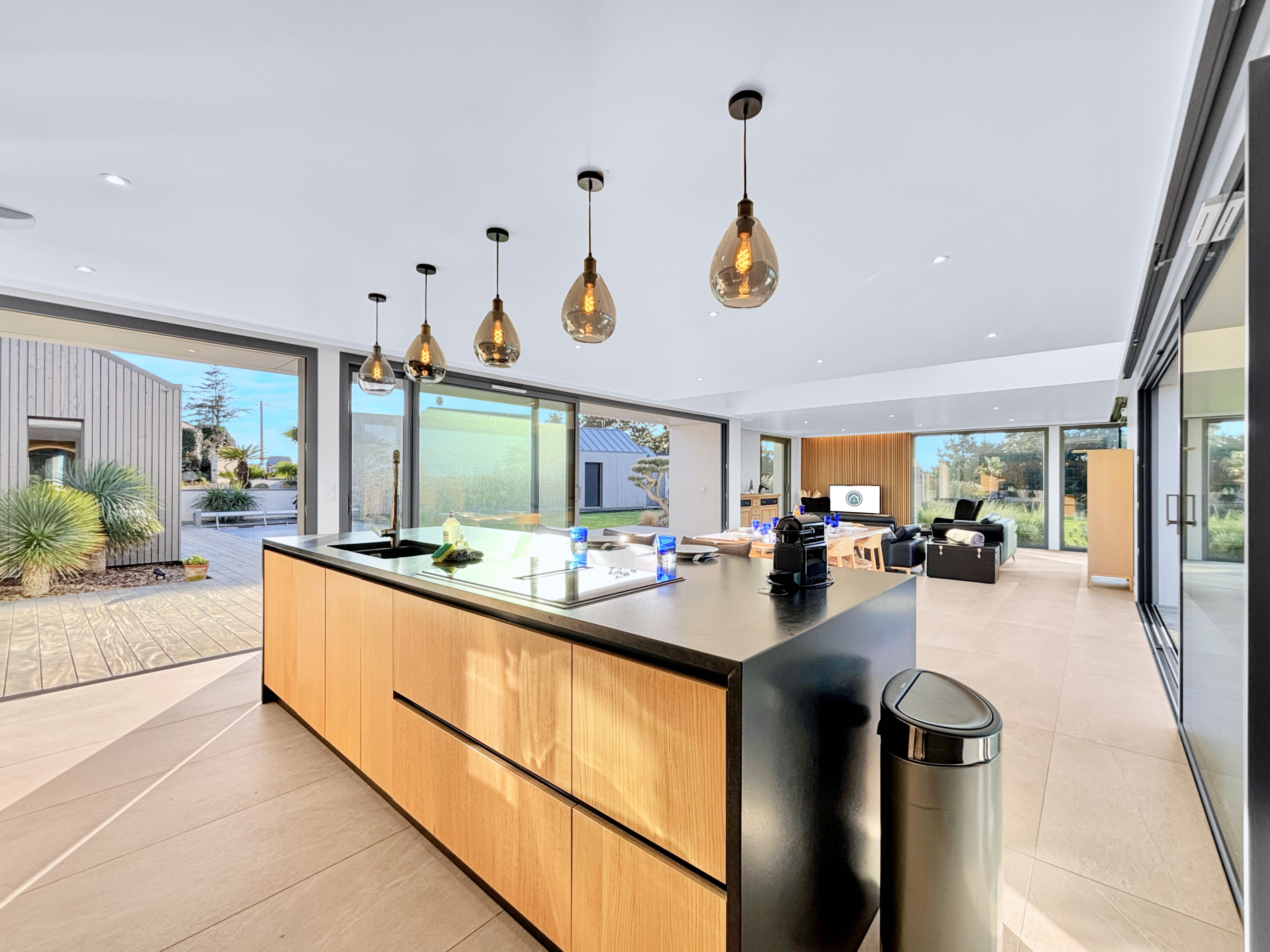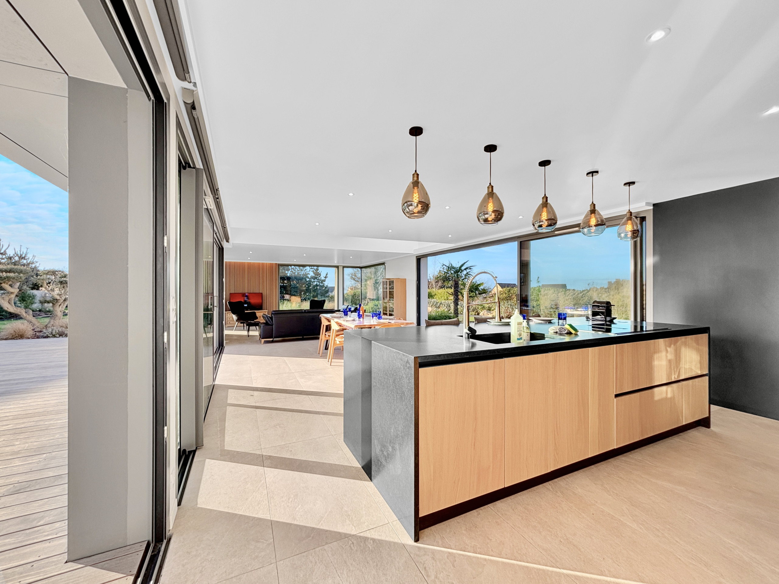 - rez-de-jardin : une ravissante entrée de type verrière, une imposante pièce de vie tripartite d’environ 80m² avec espaces cuisine équipée avec îlot/séjour/salon, le tout offrant un aperçu mer et donnant sur de confortables terrasses bois et la piscine extérieure. Dans une aile, vous pourrez découvrir deux suites avec accès direct à la piscine : une première avec une chambre (lit en 160*190cm) avec TV et sa salle de bains et de douches associée. Une seconde avec une chambre (lit de 140*190cm) et sa salle d’eau privative. Pour compléter ce niveau, vous disposez d’importants rangements, d’une buanderie avec lave-linge et sèche-linge et grands placards, de deux wc indépendants.