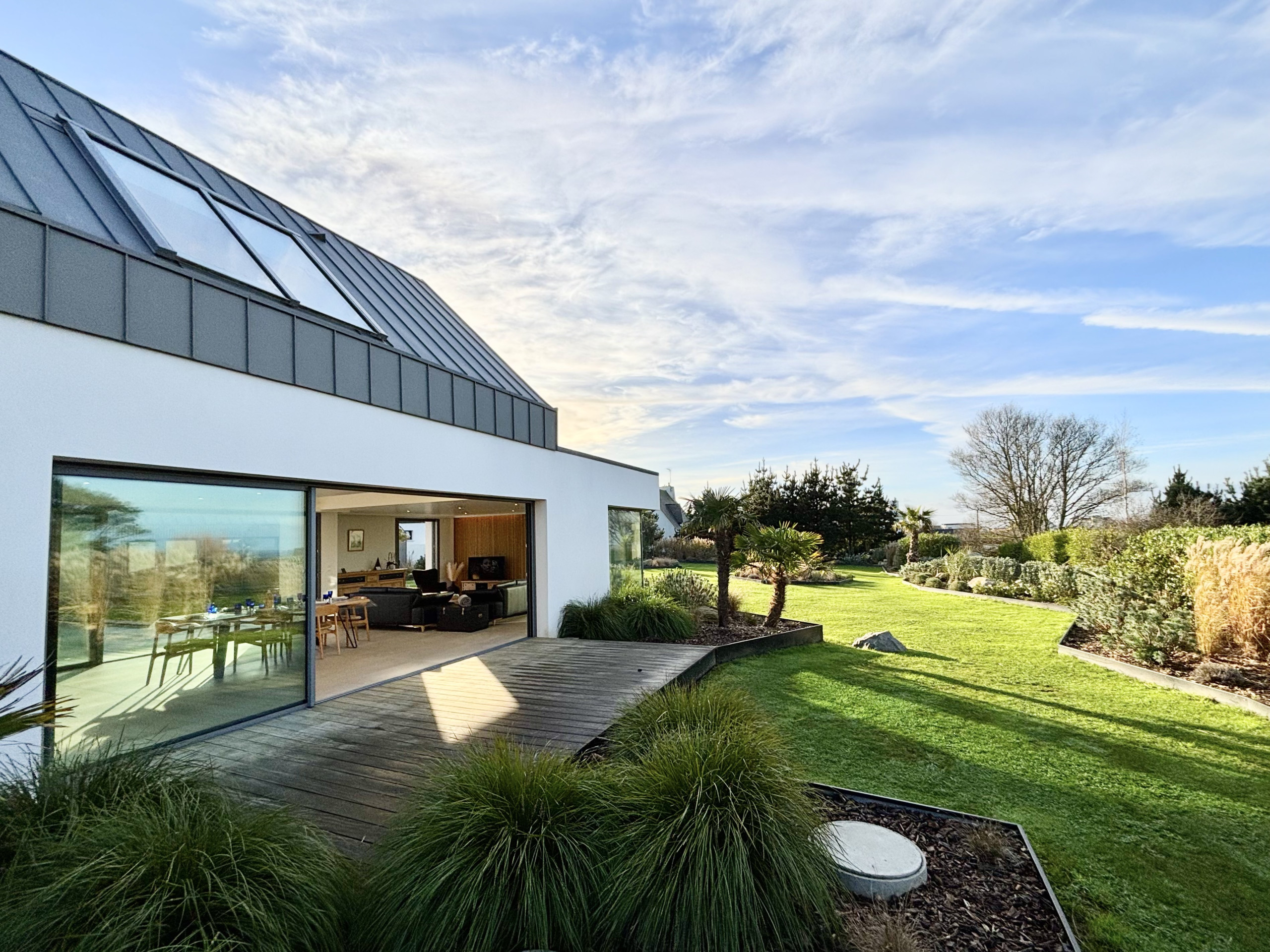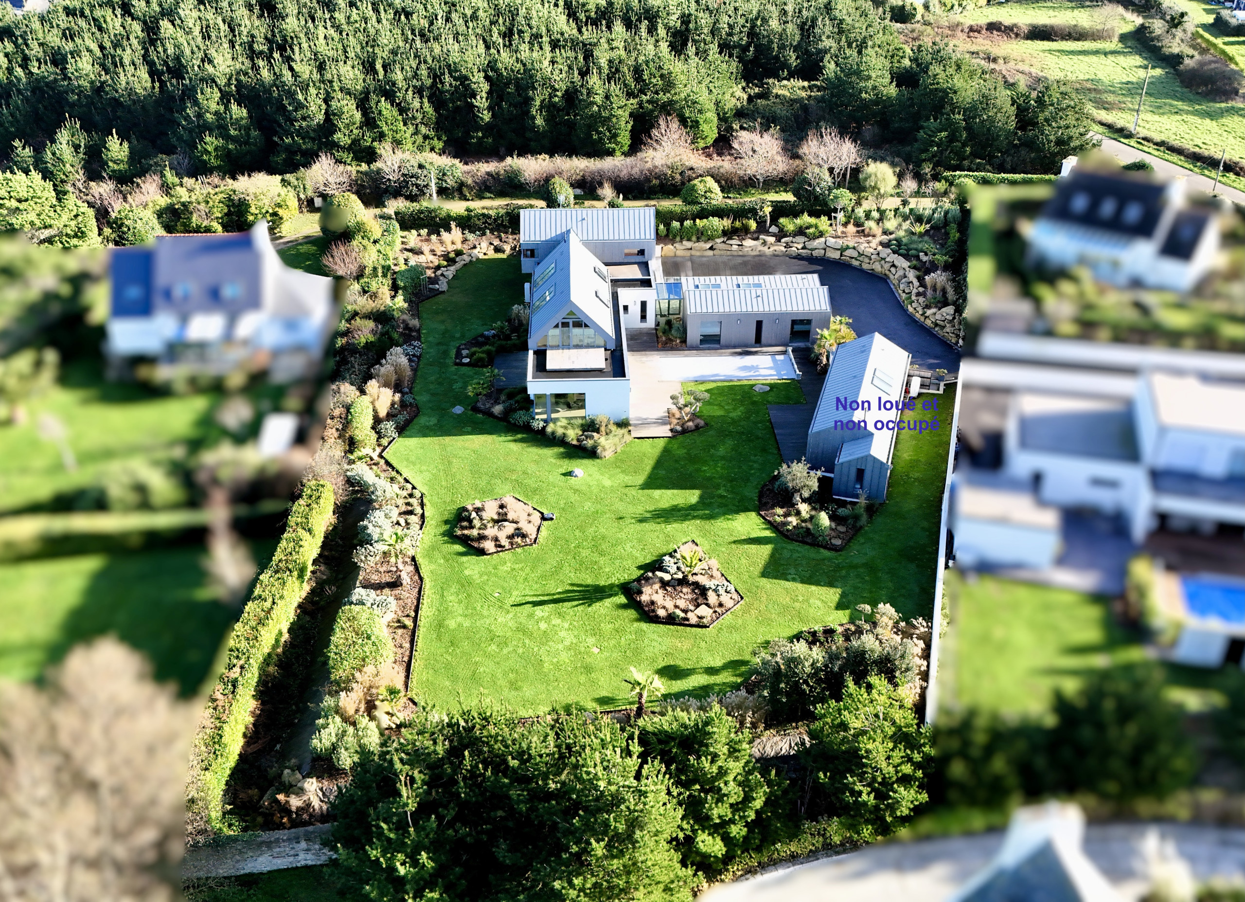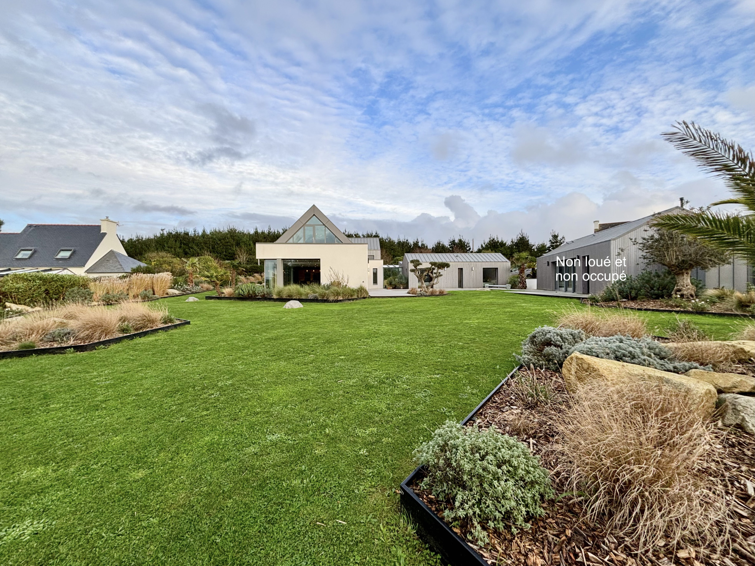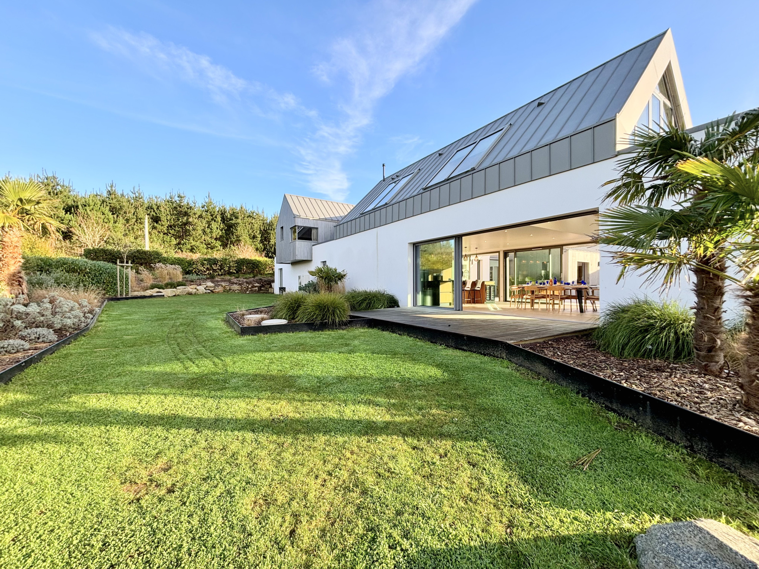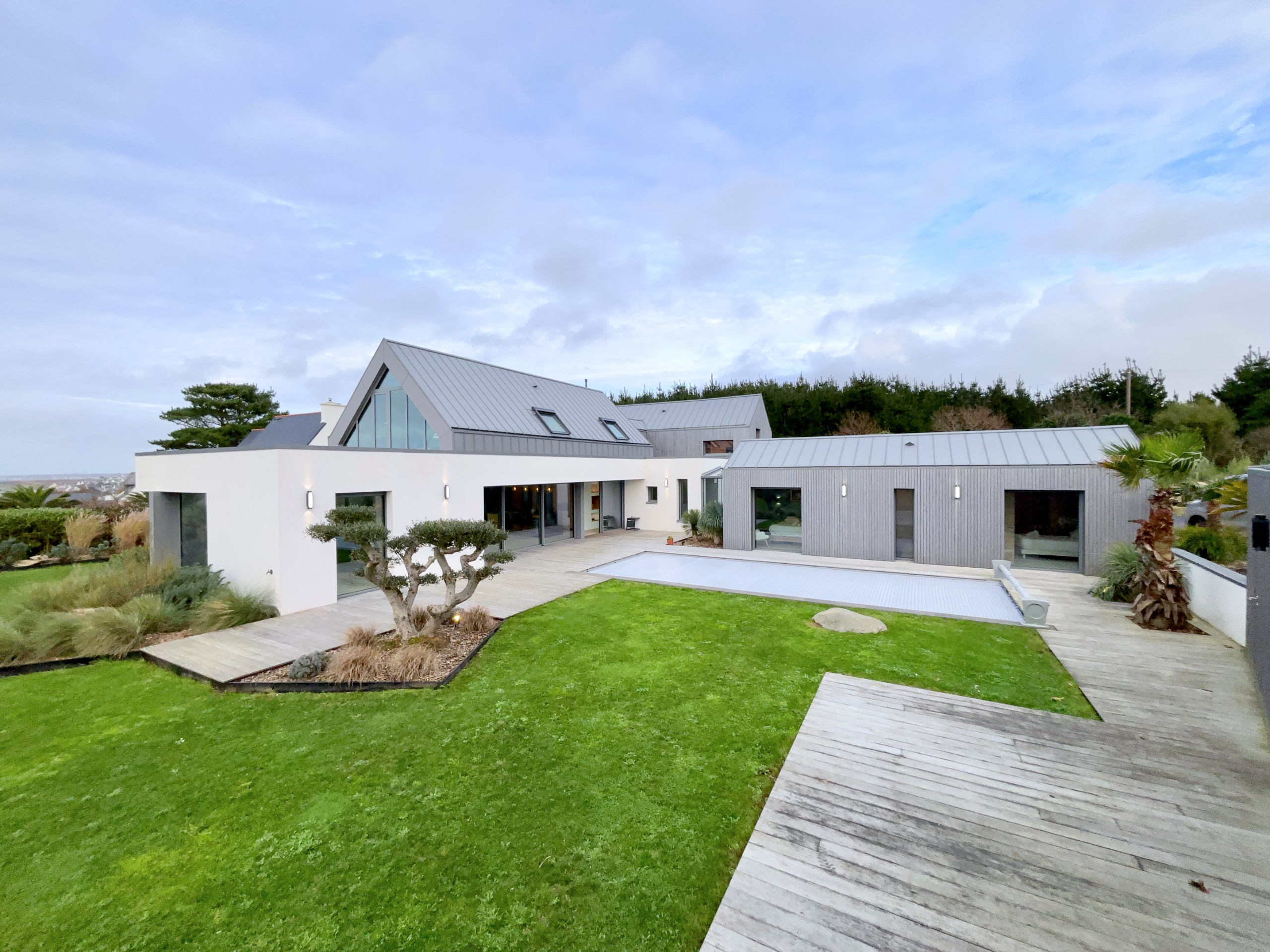 Avec un emplacement idéal à proximité des plages et pour visiter le Finistère nord, magnifique villa d’architecte haut de gamme de 228 m² avec quatre chambres, piscine, parc paysagé de 3000 m² pour 8 personnes.