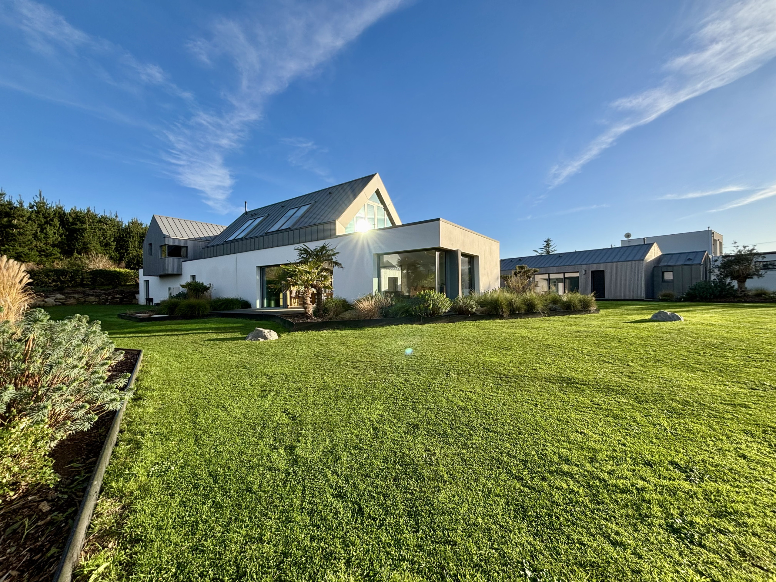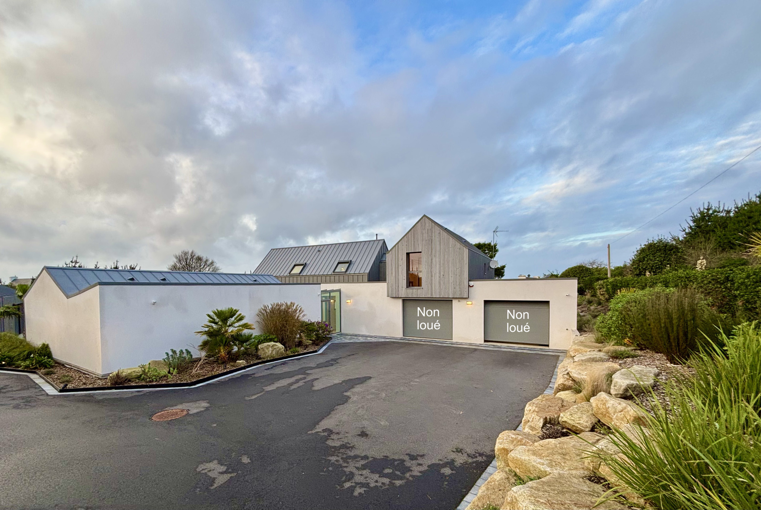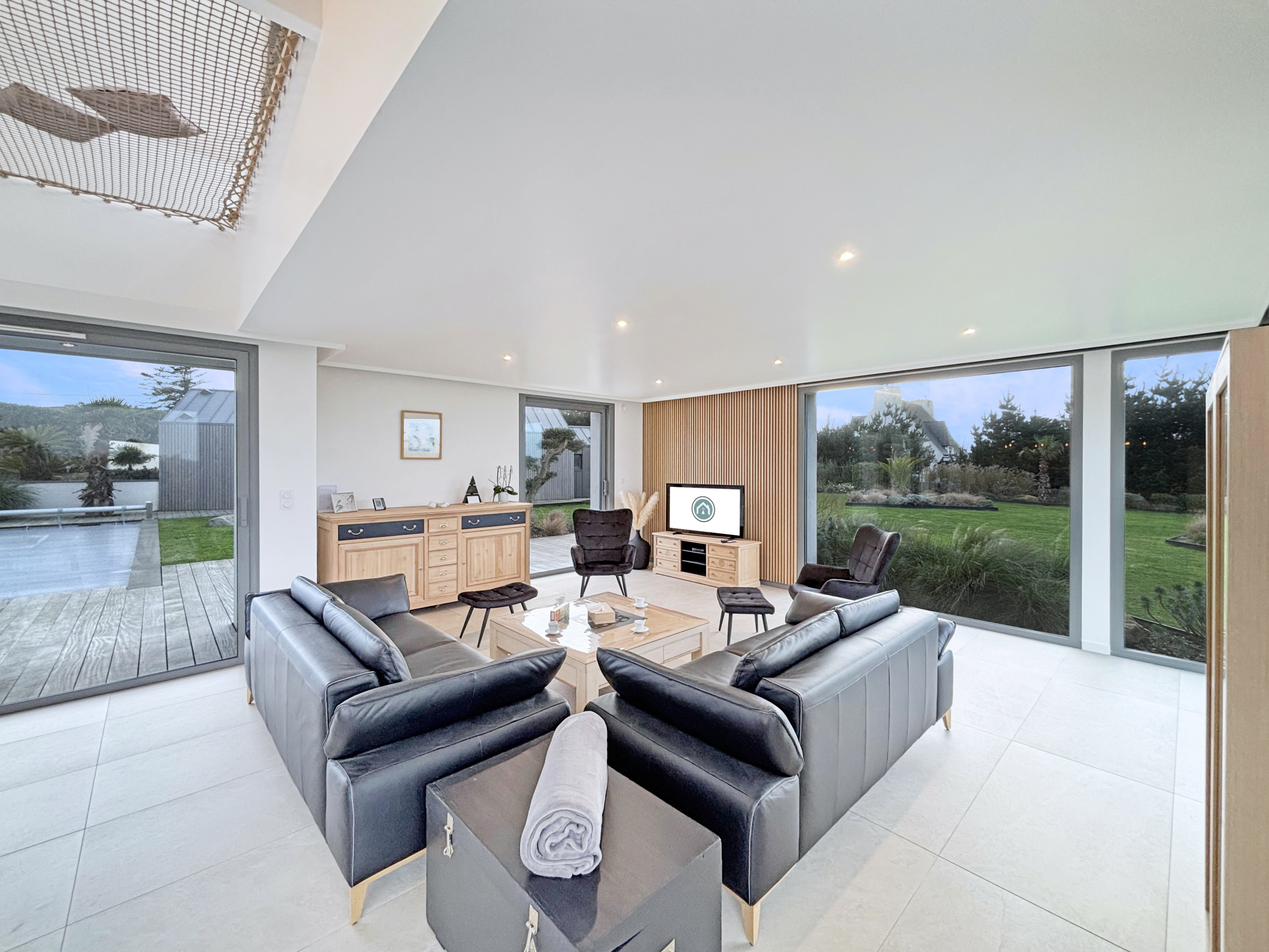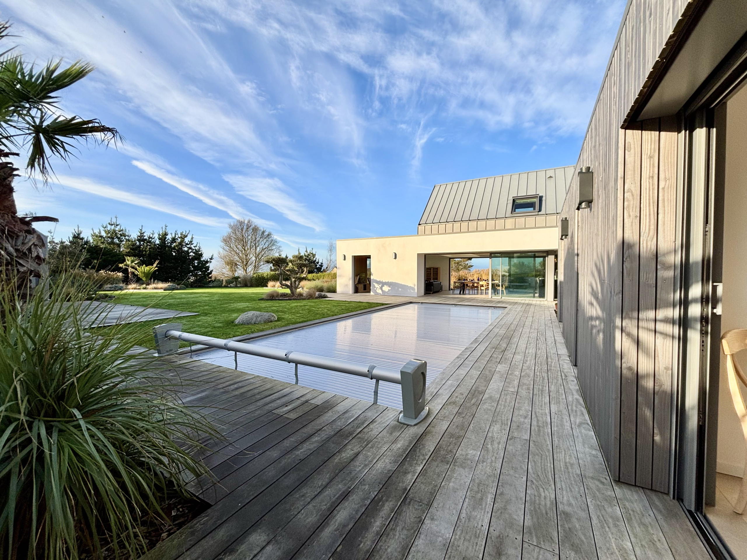 Avec un emplacement idéal à proximité des plages et pour visiter le Finistère nord, magnifique villa d’architecte haut de gamme de 228 m² avec quatre chambres, piscine, parc paysagé de 3000 m² pour 8 personnes.