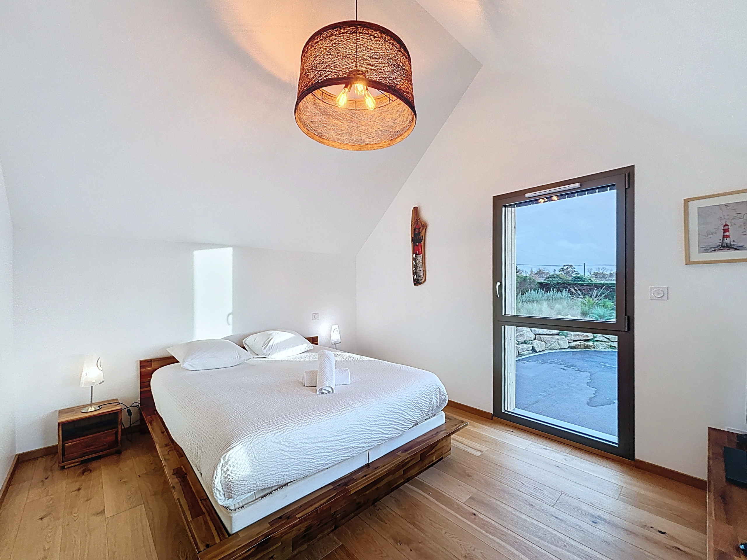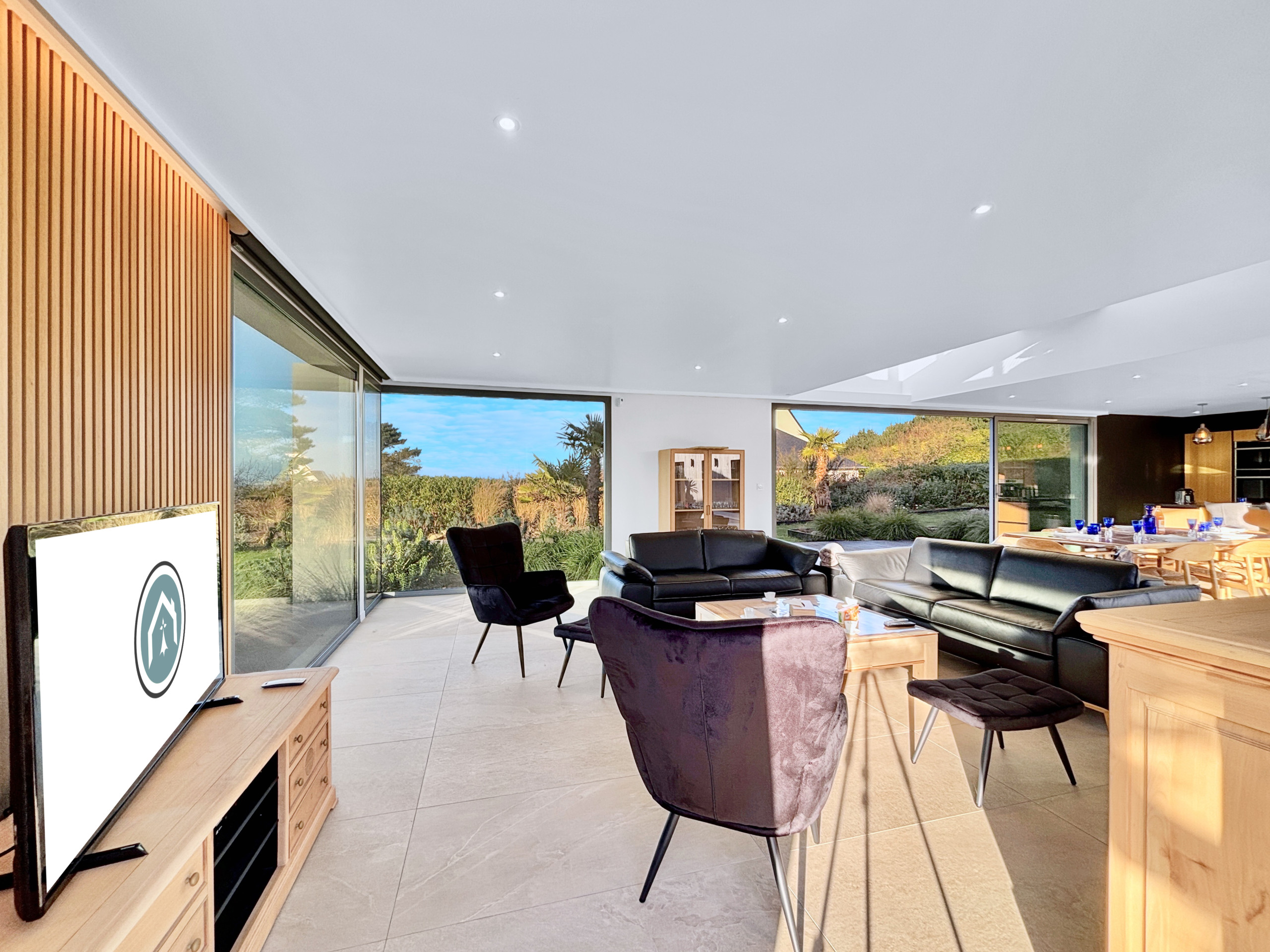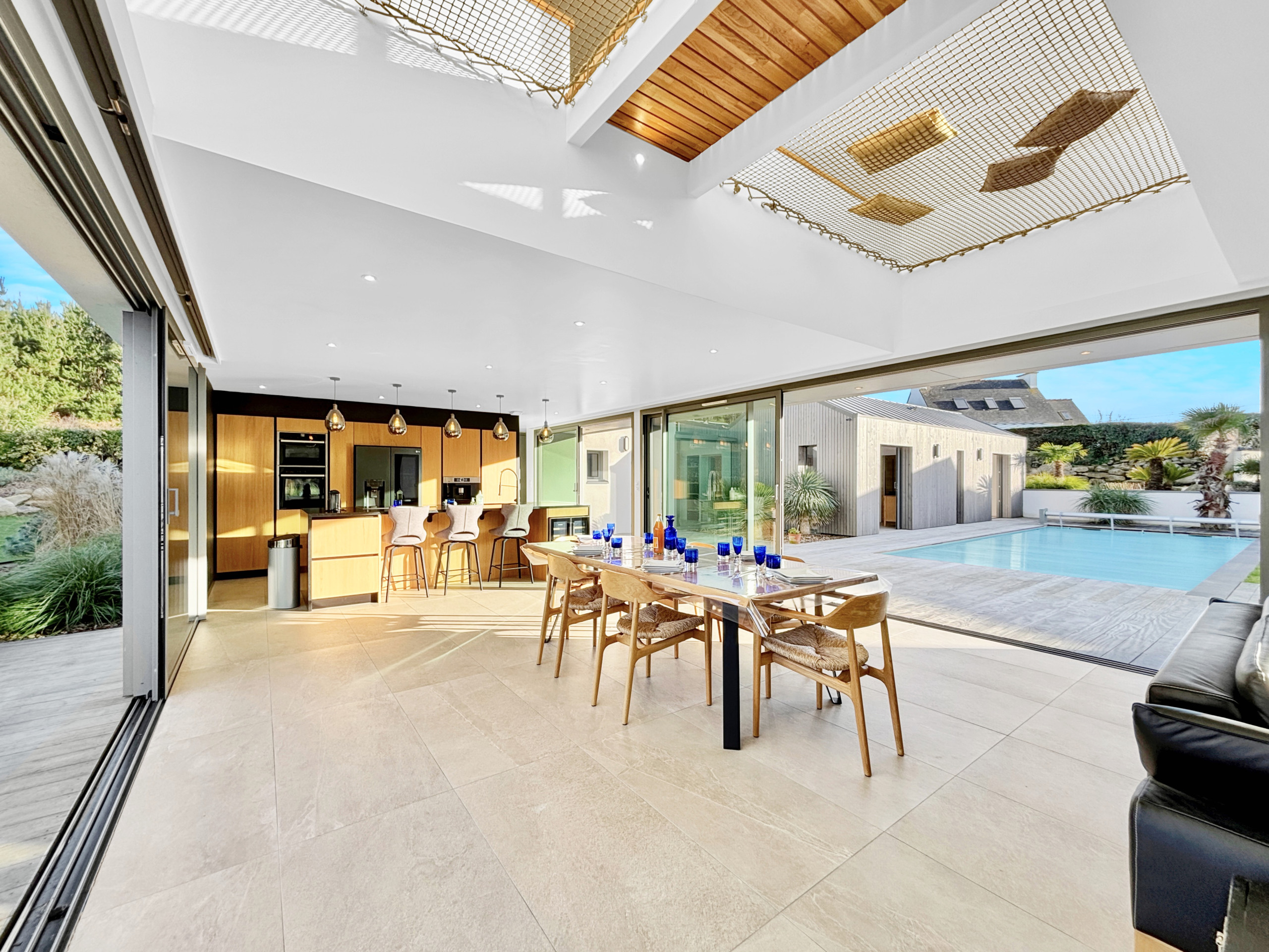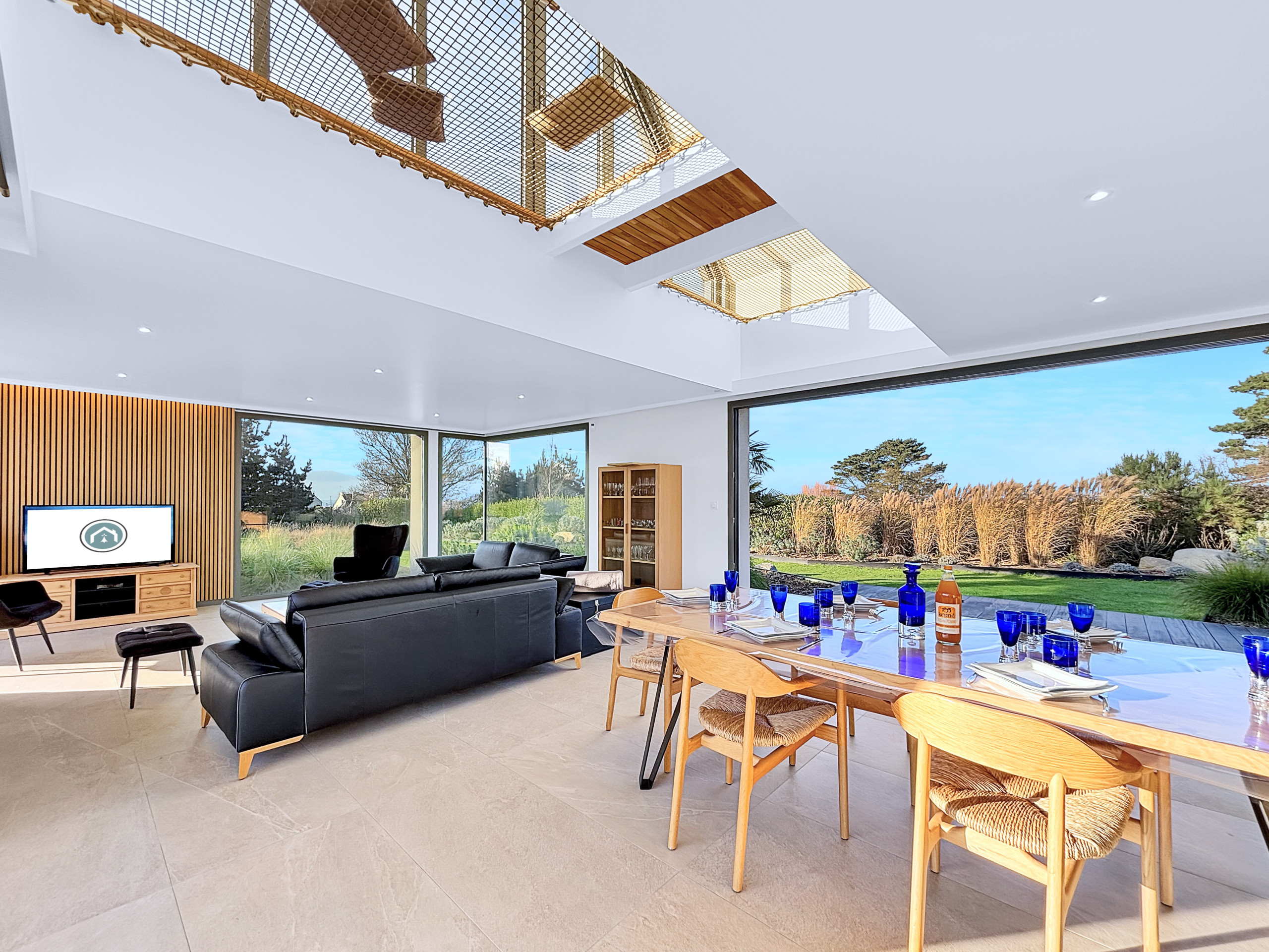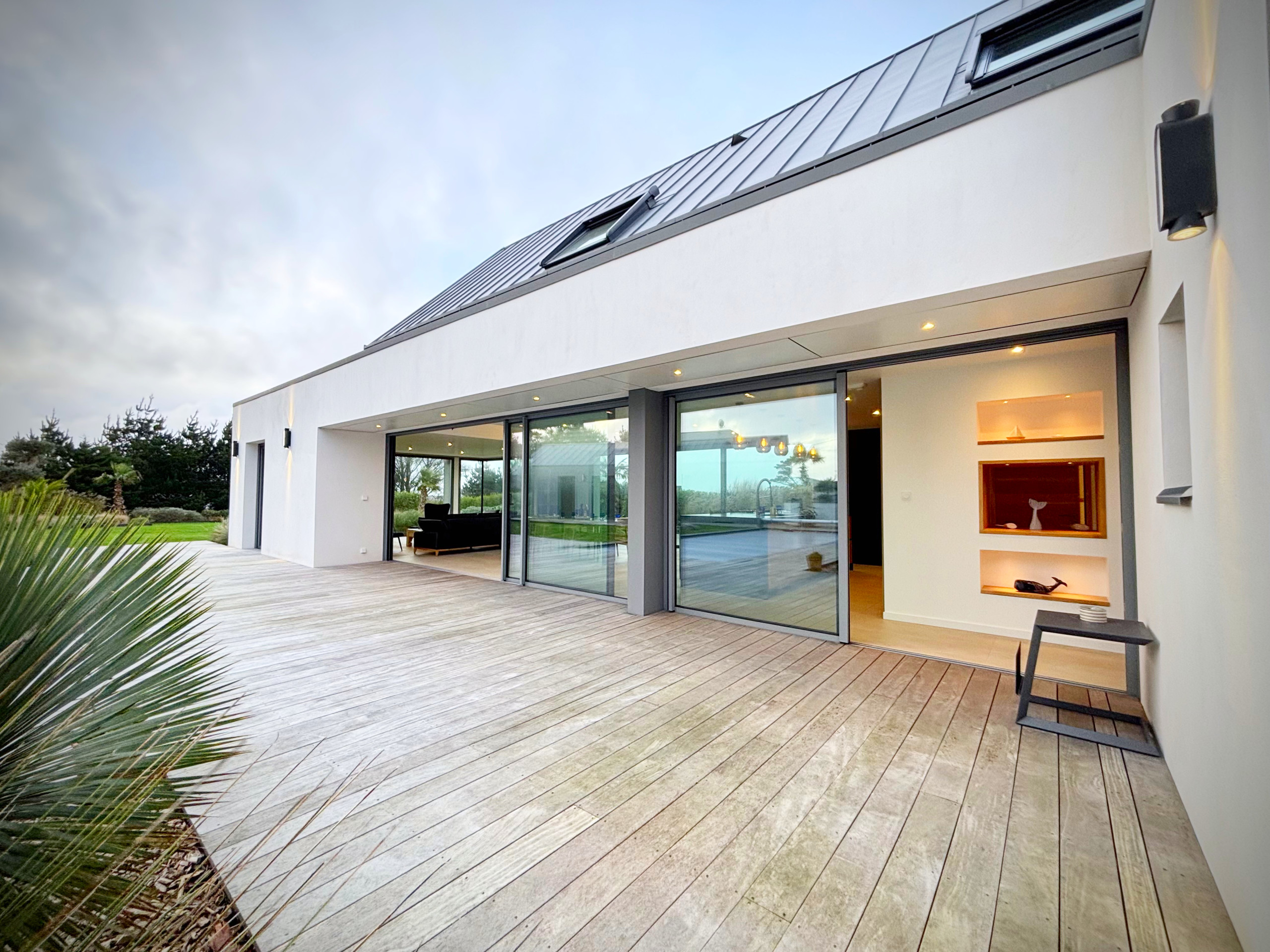 Avec un emplacement idéal à proximité des plages et pour visiter le Finistère nord, magnifique villa d’architecte haut de gamme de 228 m² avec quatre chambres, piscine, parc paysagé de 3000 m² pour 8 personnes.