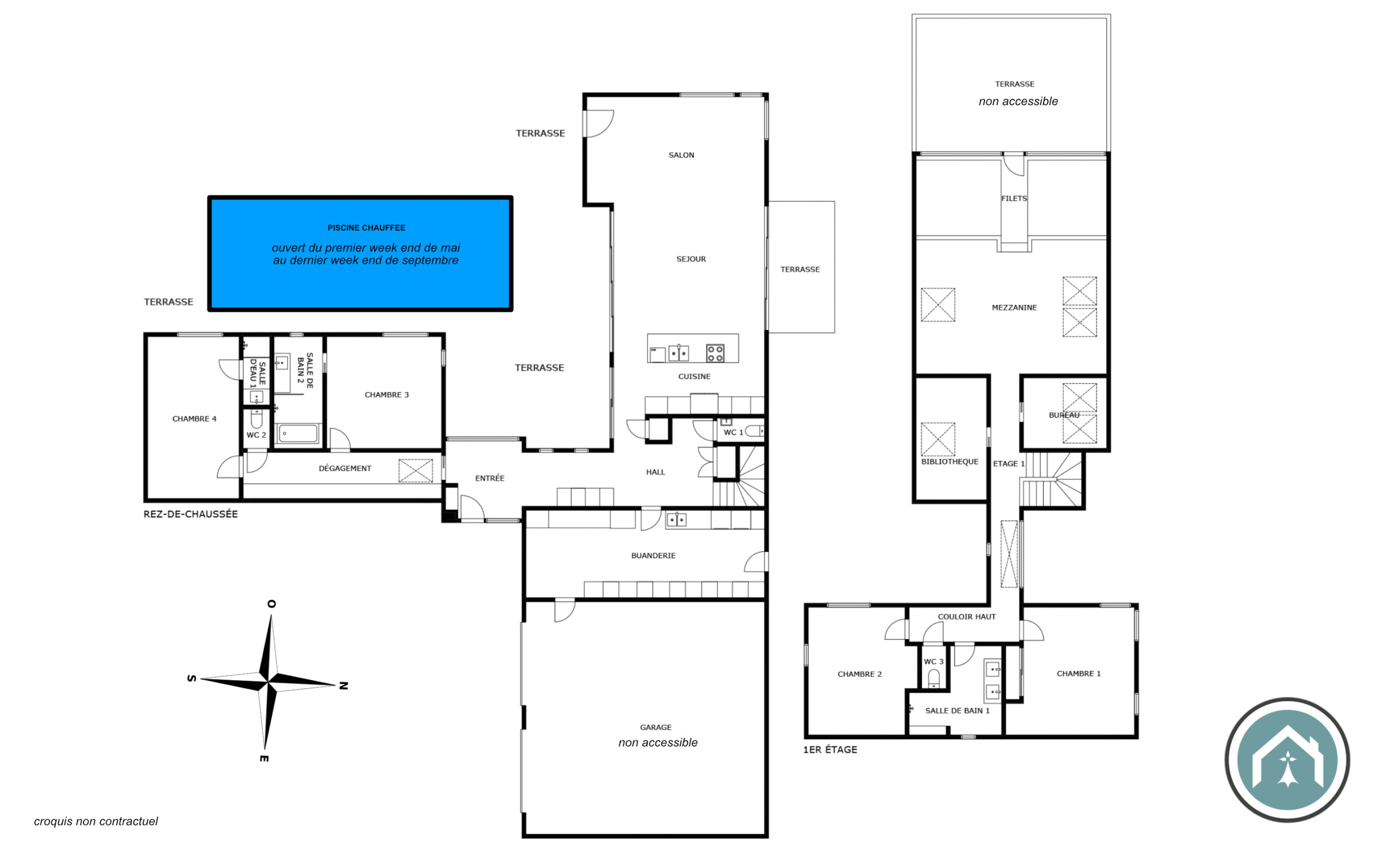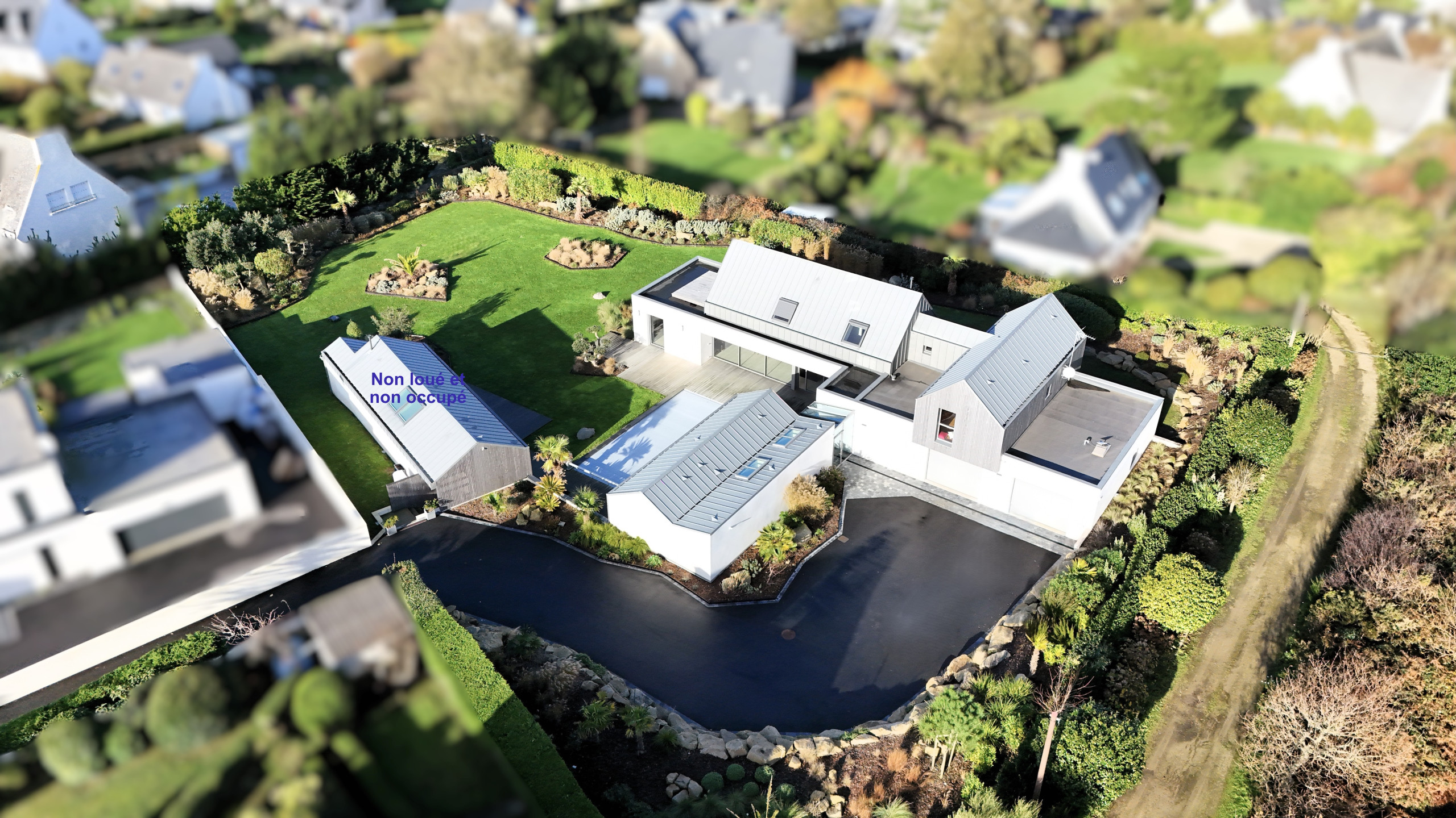 Les zones non louées et non habitées : la dépendance de l’autre côté de la piscine, les deux garages. La terrasse à l’étage au bout de la mezzanine nest pas accessible du fait de l’absence de garde-corps.